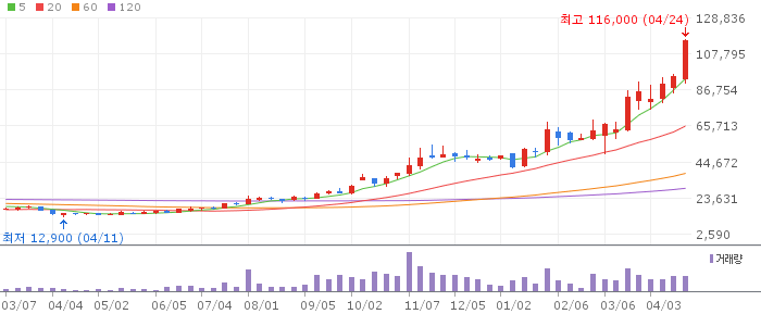 주가는 중장기 상승 이후 단기 조정 구간에 진입한 모습이다. 고점 대비 가격 조정이 진행되며 매물 소화 과정이 나타나고 있다. 다만 주요 지지선 부근에서 가격이 유지되며 상승 추세는 아직 유효하다.